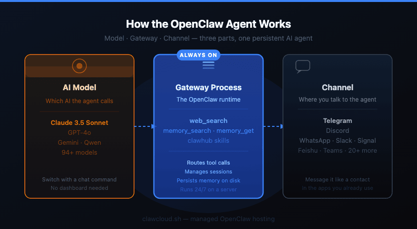 The model — the AI the agent calls. Claude, GPT-4o, Gemini, Qwen, and many more are supported. You set this in ~/.openclaw/openclaw.json and can switch models with a command from inside the chat, without touching the config file again.